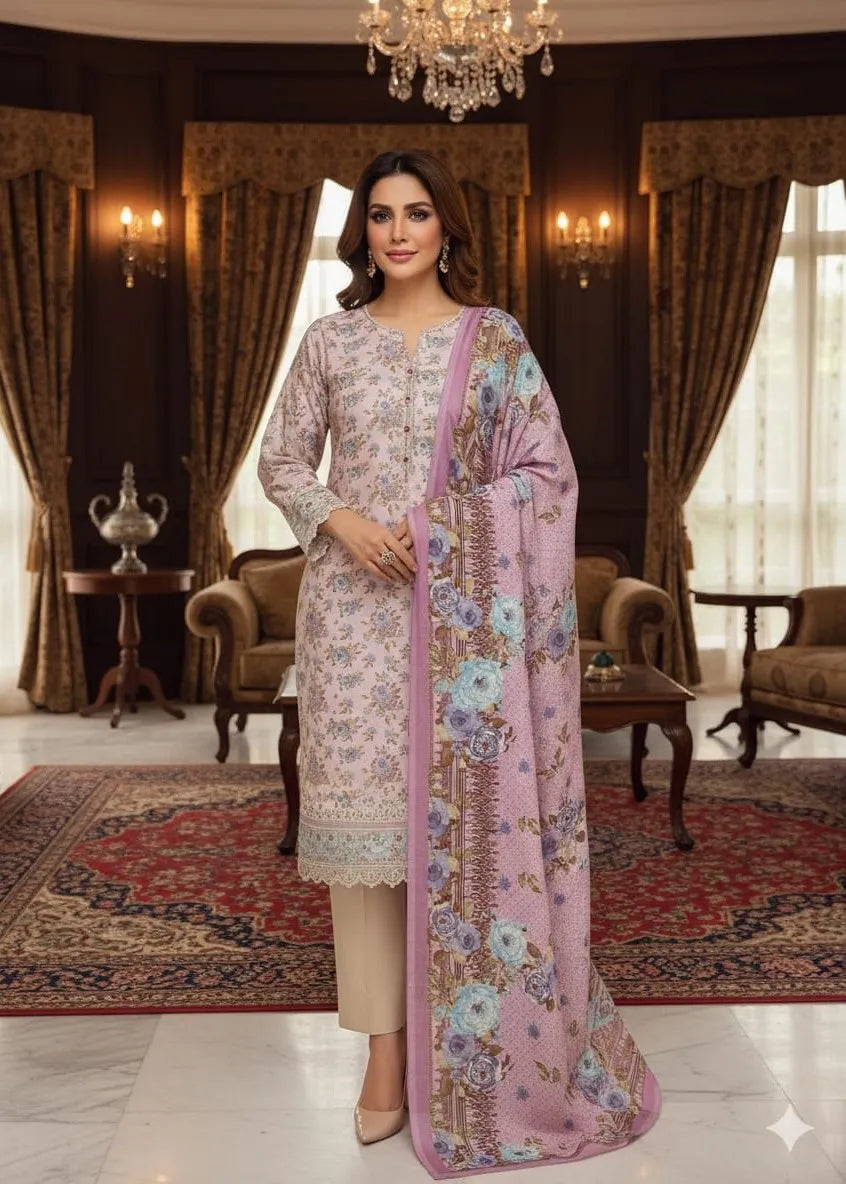 PERSIAN WOOL WINTER PRINTED 3PC SUIT (Pink Shawl)